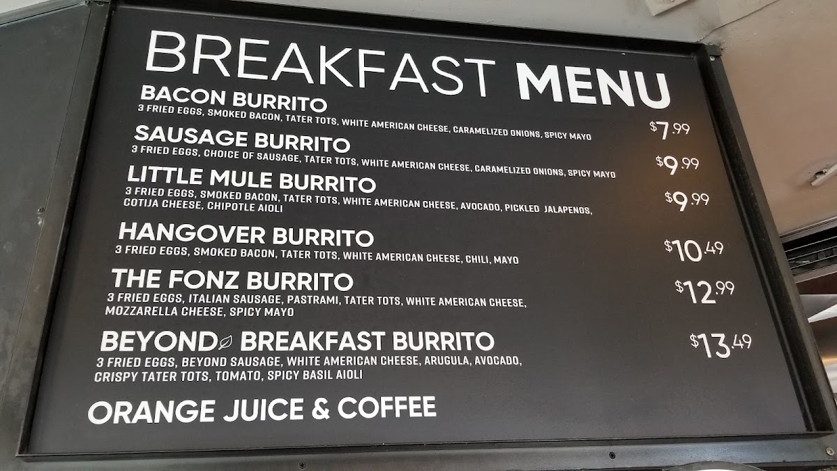 3 fresh eggs, smoked bacon, haus chili, white american cheese, crispy tater tots & mayo wrapped in a flour tortilla then grilled.